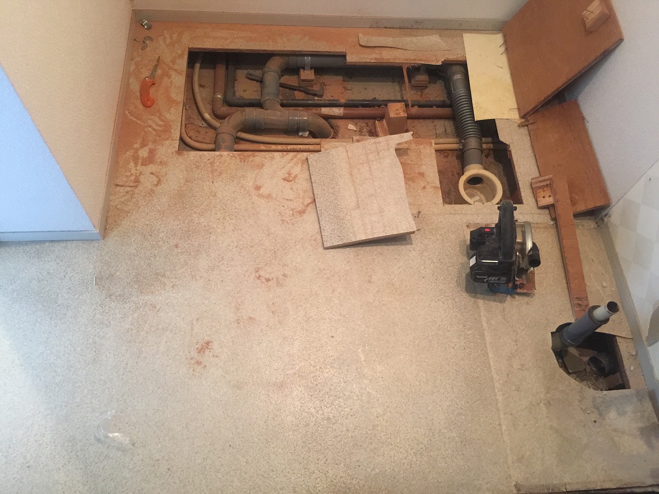 部屋内の配管は洗面所床下で各箇所へ分岐します。