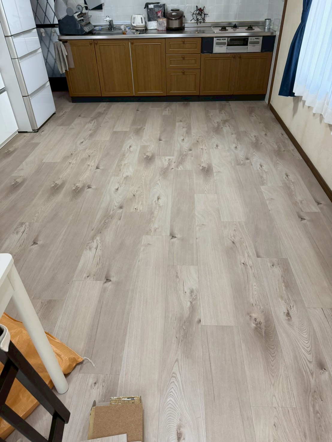 今回は既存フローリングの上に合板を施工して床を補強し、その上にサンゲツのフロアータイルで仕上げました。